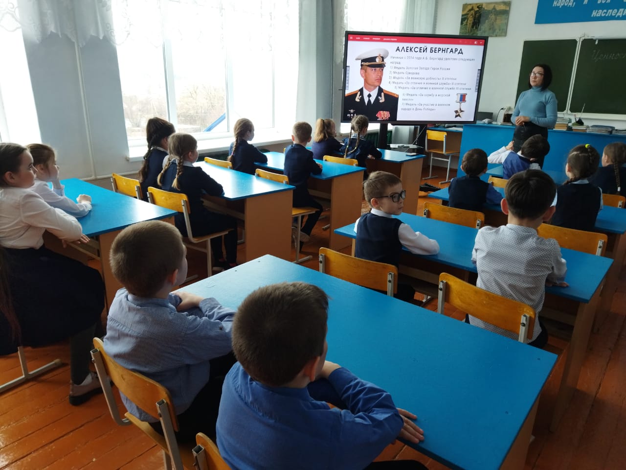 В начальной школе был проведен урок "Ценности и героизм" из цикла уроков "Герои нашего времени". На уроке были разобраны понятия "Родина" и "Патриотизм", дети познакомились с биографией современного героя Алексея Борисовича Бернгарда.