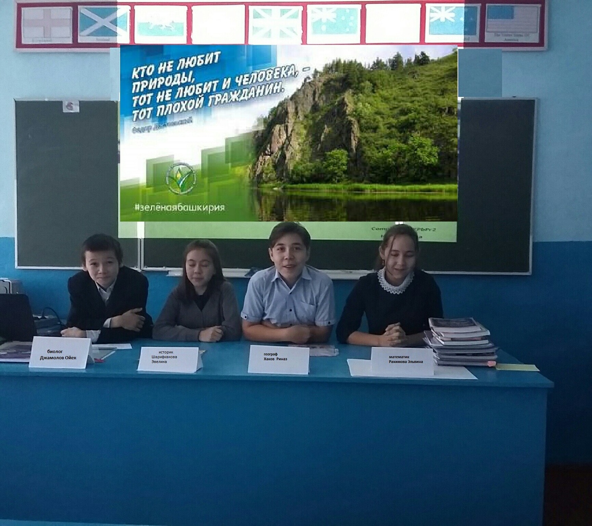 Первая часть урока прошла в форме конференции, на которой участвовали: биолог, историк, математик, географ (дети сами). Целью данной конференции была-обсуждение экологических проблем в РФ и РБ и возможные пути их решения. Биолог рассказал, что наша экология становится все хуже и хуже с каждым днем, леса постепенно исчезают, люди вырубают деревья, рассказал, что такое опасные отходы. Географ рассказал, что много людей ездят на машинах и автомобилях, оставляют мусор в местах пикников и они не всегда думают о загрязнение воздуха, загрязнение рек, озер и лесов. Он еще привел интересный факт, что в Индонезийском городе Сурабая можно рассчитаться за проезд в автобусе пластиковыми бутылками. Двухчасовая поездка обойдется в 10 пластиковых стаканчиков или пять бутылок, в зависимости от их размера. Такое новшество, по мнению города, поможет ему достичь амбициозной цели освободиться от пластиковых отходов к 2020 году.Математик привела статические данные в цифрах. Делая простые математические суммы, дети увидели, что объем мусора, выбрасываемый в окружающую среду, шокирующий. Историк рассказала, что пионеры соревновались в сборе макулатуры и металла, которые были доставлены в центры утилизации, люди были более экологически чистые, что людям нужно изучать экологические традиции предыдущих поколений. Обсуждали, как внести свой вклад в решение мусорной проблемы. Далее говорили о животных и растениях, которых осталось очень мало, нуждаются в особой защите и занесены в Красную книгу РБ, просмотрели видеоролик «Приглашение на экологический урок "Разделяй с нами"», «побывали» на перерабатывающих предприятиях, узнали о том, как устроен раздельный сбор отходов в разных уголках планеты, и познакомились с технологиями вторичной переработки привычных вещей.