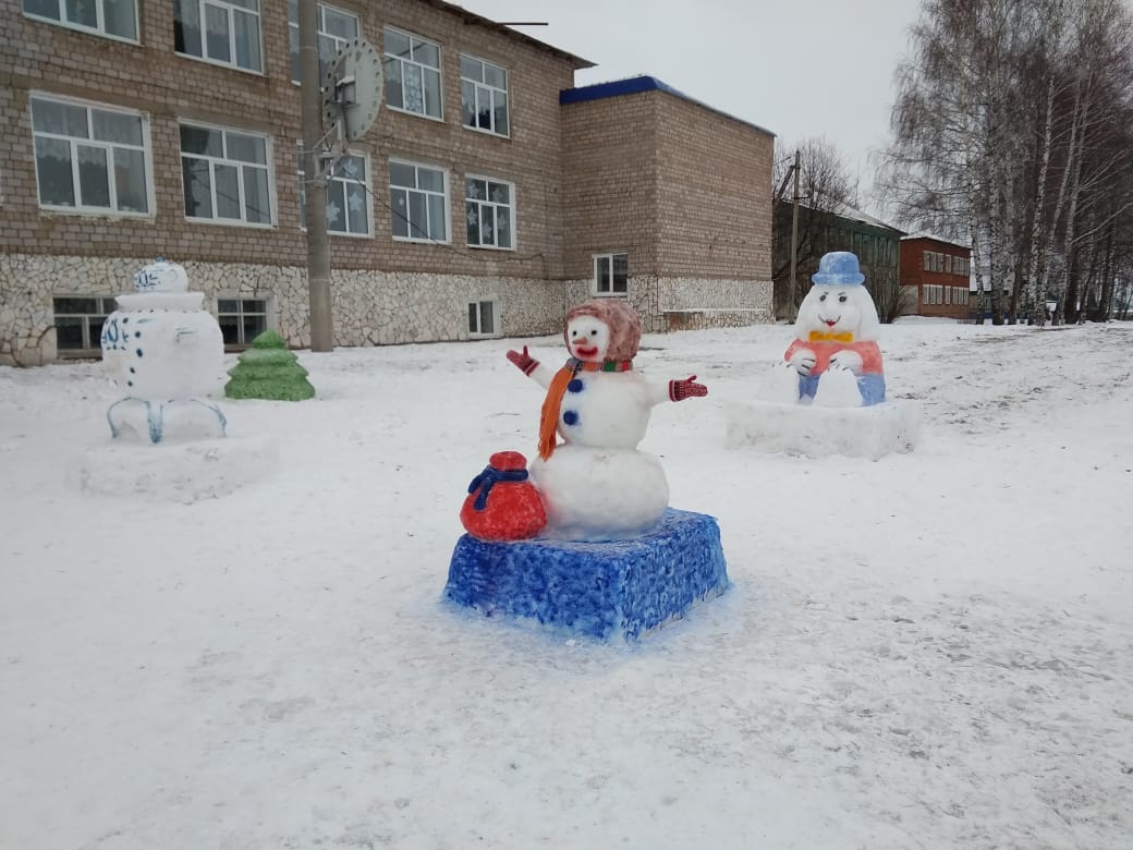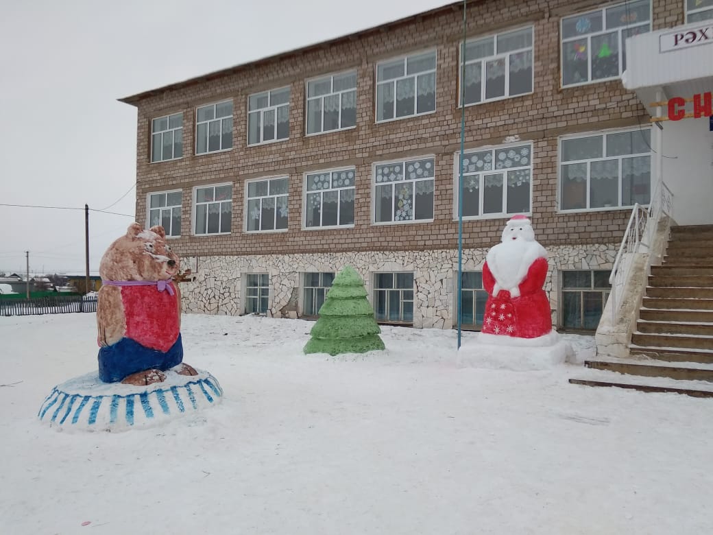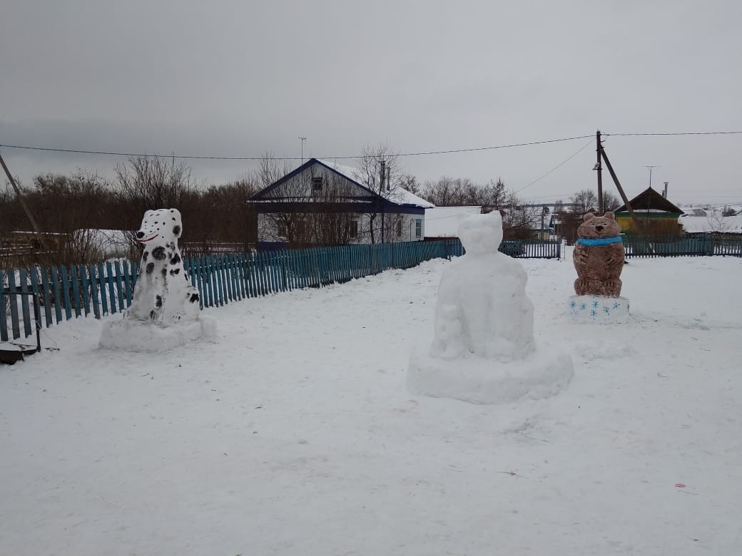 Второклассник — символ прошедшего года — Собаку. Потрудились ребята, и снежные фигуры вышли на славу! Третий класс сделал огромного Зайчика. У четвёртого класса получился отличный Снеговик. Шестой, седьмой классы сделали семью медведей, посвящённый Году семьи. Пятый класс — русский самовар. У старших классов получились главные символы Нового года — Дед Мороз со Снегурочкой рядом с ёлкой.