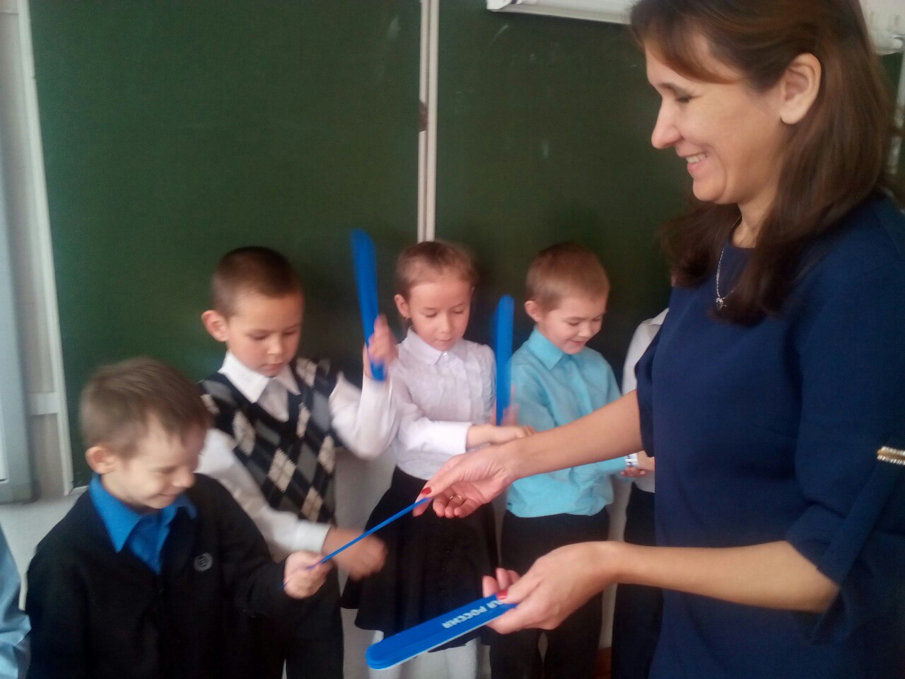 Директор школы раздала первоклассникам подарки -светоотражающие браслеты.