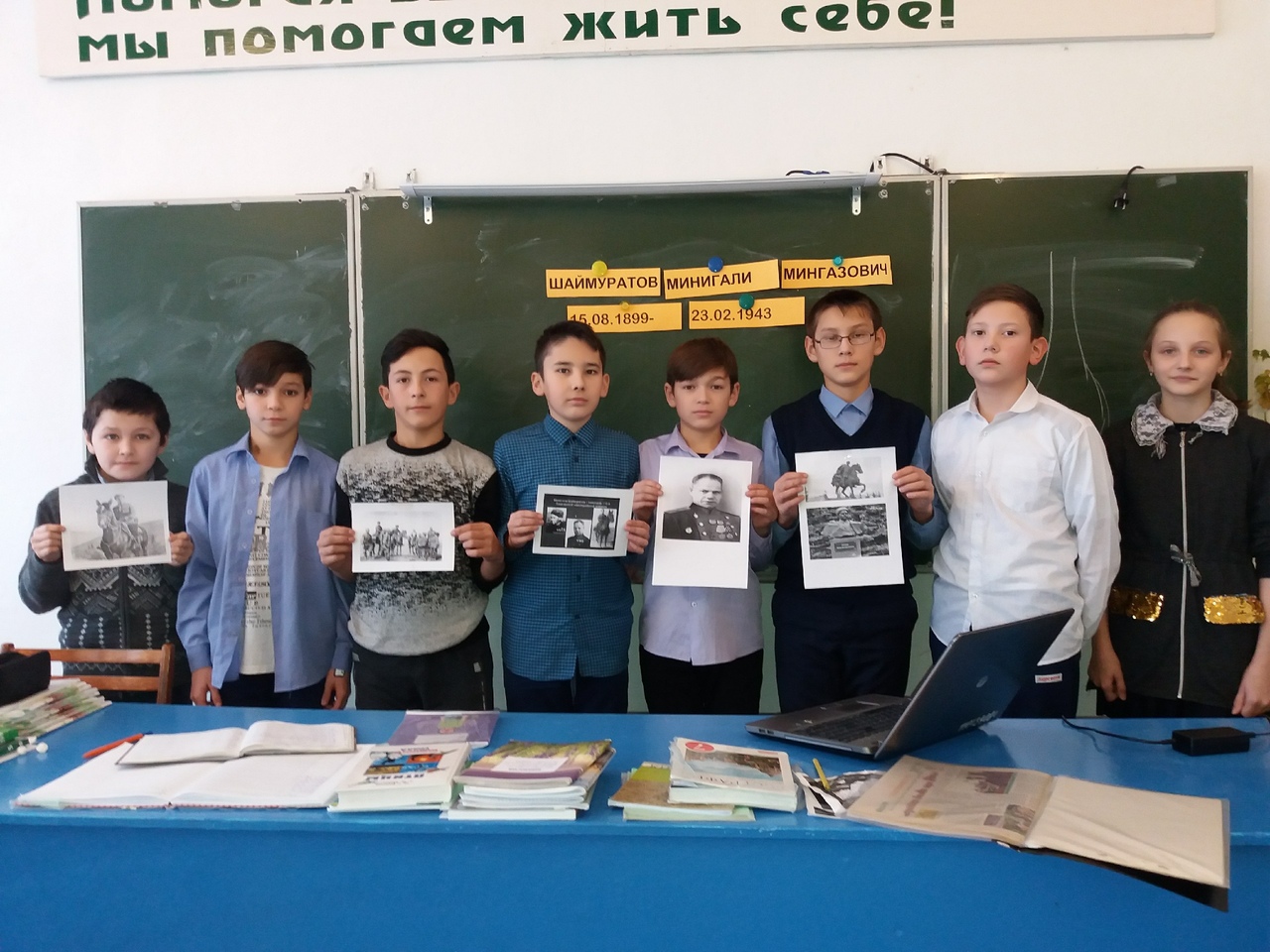 В ходе классного часа учащиеся дополнили свои знания новыми интересными фактами из истории Великой Отечественной войны, на примере ознакомления с биографией и героизмом народного героя Башкортостана М.М.Шаймуратова. Провела классный руководитель 6 класса Ахметова.И.Г.