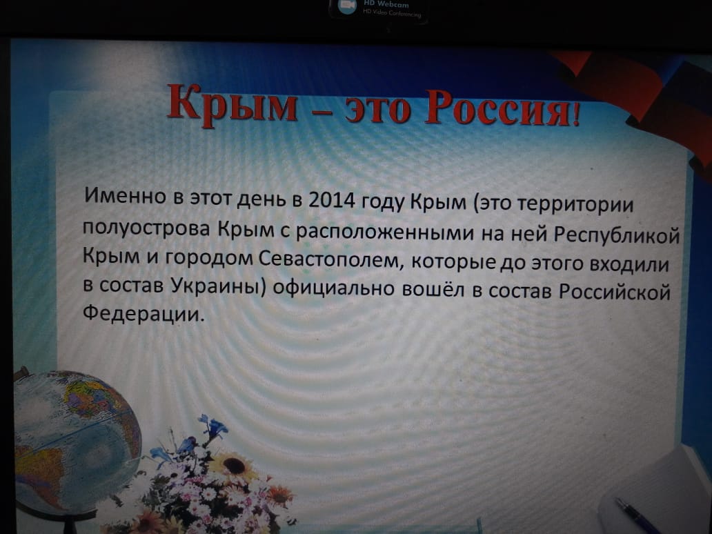 18 марта 2014 года произошло важное для всех нас историческое событие - полуостров Крым вошел в состав Российской Федерации. В честь этого события 18 марта 2020 года в начальной школе был проведен классный час «Крым и Россия едины!».