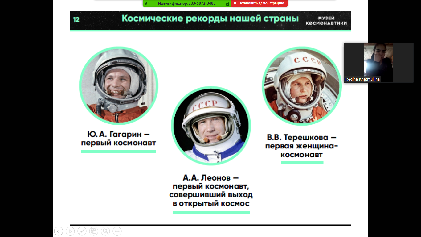В рамках празднования Дня космонавтики классный руководитель Альбина Магдановна в 9 классе провела онлайн - урок на тему: «Космос – это мы». На уроке освещались вопросы о роли СССР и России в освоении космоса, о значимости полета Ю.А. Гагарина, о космических юбилеях страны: 55-летие полета В.В. Терешковой, единственной женщины в мире, совершившей орбитальный полет на одноместном космическом корабле, 30-летие программы «Буран», 20-летие нахождения Международной космической станции на орбите. Так же говорили о космических рекордах нашей страны: СССР первым вывел искусственный спутник Земли на орбиту, первое животное на орбите, собака Лайка, была запущена в космос благодаря советским ученым, знаменитые собаки Белка и Стрелка после суточного полета на борту второго советского корабля-спутника вернулись на Землю живыми и здоровыми, первая долговременная орбитальная станция, первые автоматические станции, достигшие поверхности Луны, Венеры и Марса.