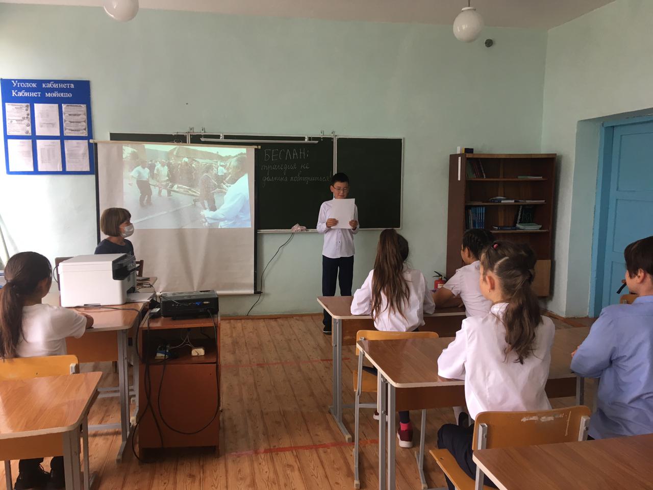 В начале классного часа ребята просмотрели фильм-клип " Трагедия в Беслане ". Побеседовали о трагедии, о её жертвах. Гиззатов Ильнар рассказал о городе Беслан, об обычном, как казалось, школьном дне 3 сентября 2004 года...