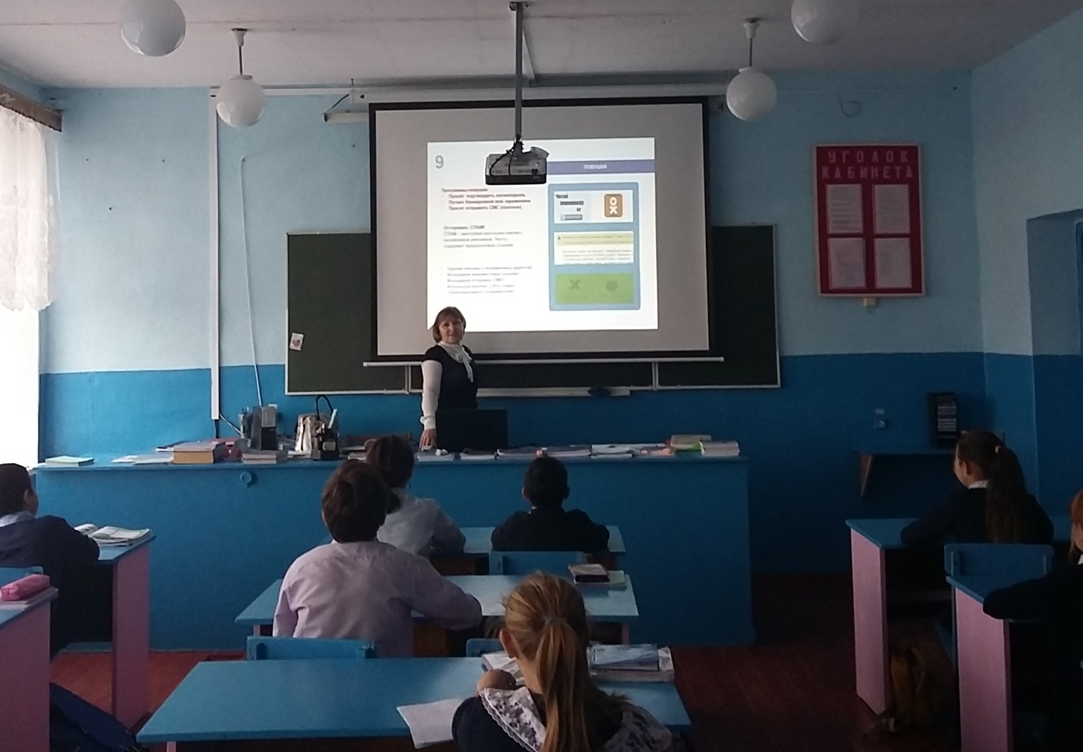 Классный руководитель напомнила детям об основных угрозах для детей в сети: через системы мгновенного обмена сообщениями, через электронную почту, программы обмена файлами, в соцсетях, при использовании мобильных телефонов, довела до сведения учащихся о видах информации способной причинить вред здоровью несовершеннолетних, а также о негативных последствиях распространения такой информации в сетях Интернет и мобильной (сотовой) связи. Была продемонстрирована презентация с различными ситуациями по данной тематике. Дети также просмотрели видеоролик о приемах в области интернет безопасности «Интернет – это добро или зло?», показ которого классный руководитель сопровождала комментариями по сути выполняемых действий и их назначению, предостережением от различных действий.