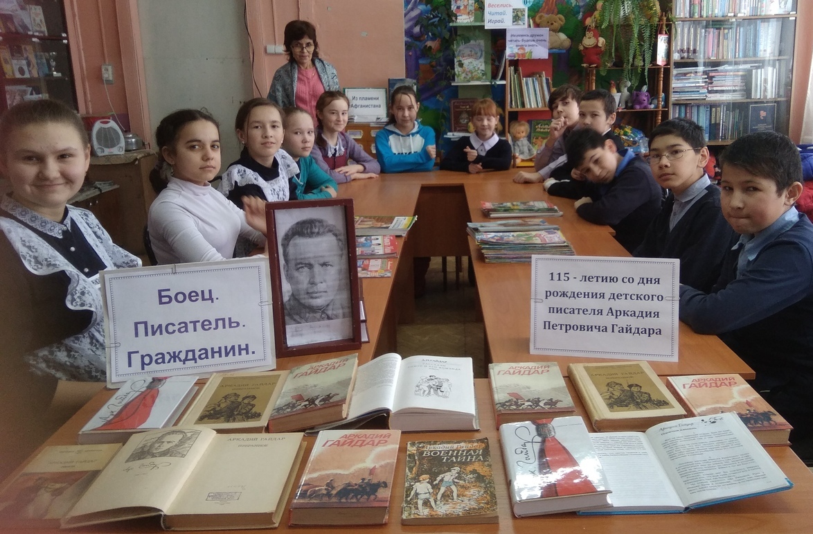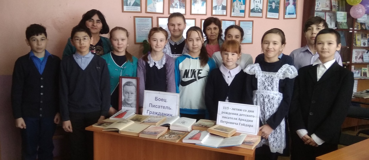 Обучающиеся 6 класса вместе с учителем Гаязовой З.И. посетили библиотеку, где вместе с библиотекарями проводили литературный час « Гайдар шагает впереди». Из-под его пера вышло немало замечательных детских книг. Вдохновившись книгой «Тимур и его команда», пионеры брали шефство над ветеранами и пенсионерами, оказывая им посильную помощь. Очень отрадно, что это продолжается и в наши дни.