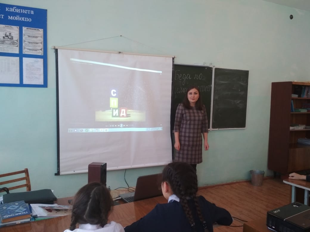 Классный руководитель-Гиззатова М.Ф. познакомила детей с понятием СПИД, рассказала о сути заболевания. Приглашённый гость - библиотекарь с.Аксаитово - Лукманова Г.Ф. рассказала детям о путях передачи ВИЧ-инфекции. Также разъяснила правила гигиены и развеяла мифы об опасности дружбы, беседы, общения с ВИЧ инфицированными. Дети с интересом просмотрели видеопрезентацию о СПИД и ВИЧ. В завершение урока дети написали синквейны на тему "СПИД".