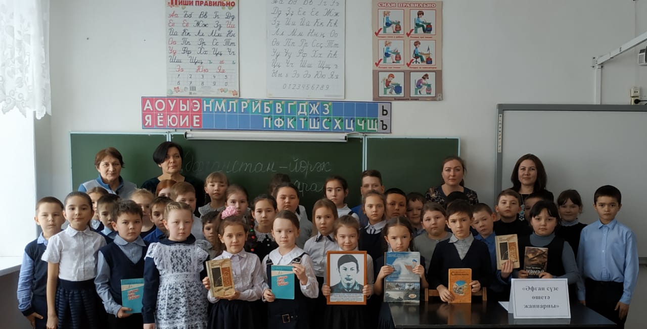 Фатхутдинов Рафиль (Аксаитово), Лутфуллин Ильшат (Ильметово), Имамов Ильгам (Юсупово), Мухамадуллин Радим (Аксаитово) - ветераны боевых действий. Ребята смотрели альбом про нашего земляка Мухамадуллина Радима Насимьяновича, кавалера ордена "Красной звезды", погибшего на войне в Афганистане. Память павшим в Афганской войне почтили минутой молчания. Была оформлена книжная выставка "Афган сузе ошетэ жаннарны".