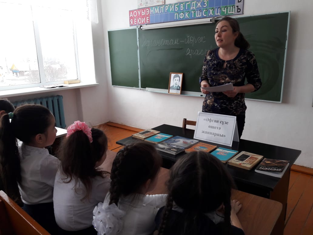 В связи с этой датой во 2- 4 классах был проведен урок мужества"Афганистан - йорэк ярасы». Библиотекарь Лукманова Г.Ф.рассказала о воинах-интернационалистах, о наших земляках, воевавших в Афганистане.