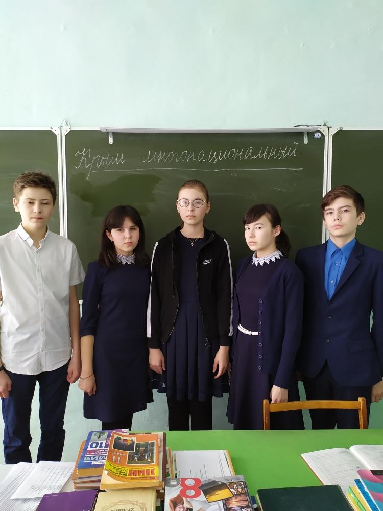 17 марта в 8 классе классным руководителем Гайнуллиной О. С. был проведен классный час на тему "Крым многонациональный". В ходе классного часа детям прививалось уважительное отношение к государственным символам России и Крыма, Конституции - основному закону страны,а так же воспитывалось чувство гордости и патриотизма.