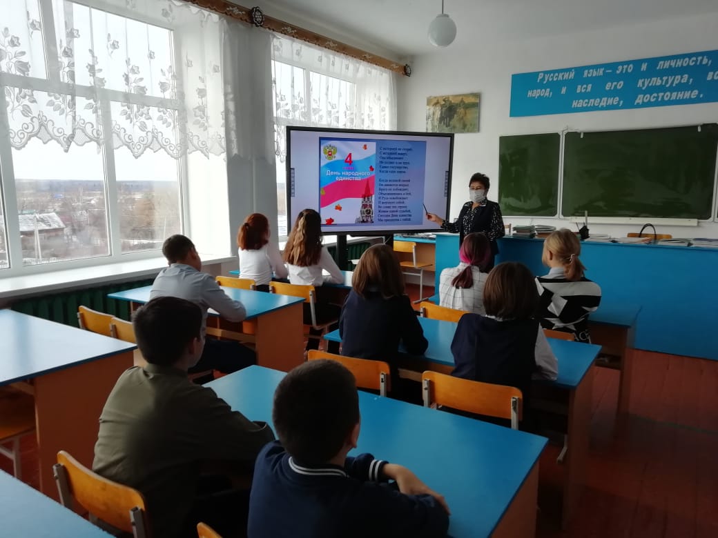 Учащиеся читали стихи, посвященные знаменательной дате, вспоминали пословицы о Родине. Была подготовлена тематическая презентация «Единство скрепляет навеки сердца».