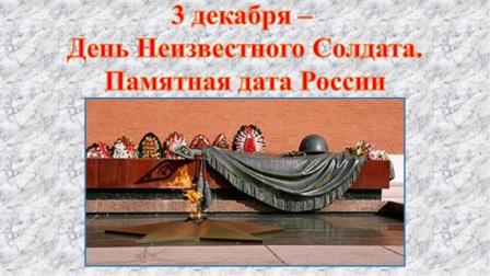 4 декабря для учащихся начальных классов проведен классный час на тему: «Имя твоё неизвестно, подвиг твой бессмертен». Дети узнали о новом памятном дне, который был принят Государственной Думой РФ. Что эта новая дата, учреждена для того, чтобы отдать дань уважения погибшим на фронтах безвестным героям, чьи имена, так и не удалось установить. Ребятам было предложено рассмотреть самые известные мемориальные комплексы и памятники, которые расположены в Москве, в Волгограде, Омске. Ученики читали стихотворения Э. Асадова «Письмо с фронта», Е. Благининой «Письмо солдату», «Как горько нам стоять у обелисков», С. Орловой «Его зарыли в шар земной». Память погибших почтили минутой молчания.