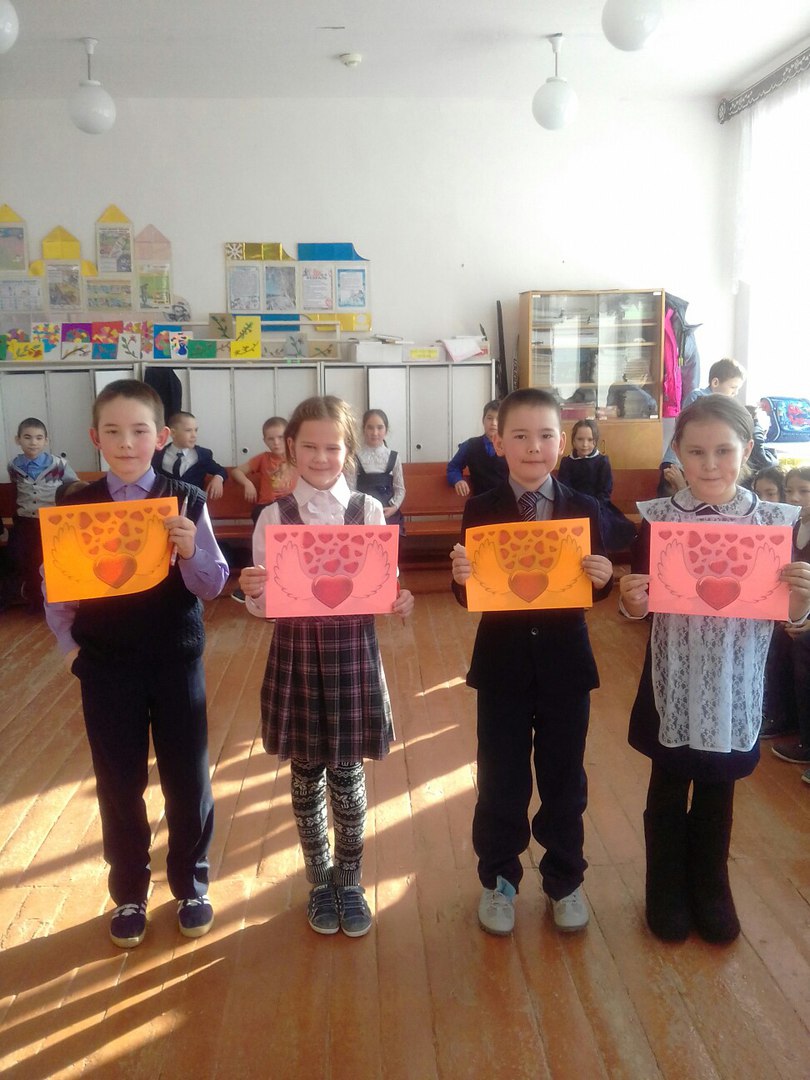 14 февраля среди учащихся 3-го класса состоялось праздничное мероприятие, посвященное дню влюбленных. День Святого Валентина – необязательный праздник в школе. Однако это прекрасная возможность поговорить с детьми о дружбе, товариществе, любви. Дети с нетерпением ждали этот праздник, готовились к нему: учили стихи, делали своими руками красивые открытки- валентинки. Мероприятие проходило в весёлой атмосфере. Работала «Почта любви», и все желающие могли отправить валентинки своим друзьям, одноклассникам, учителям. Дети активно принимали участие во всех конкурсах, рассказывали стихи, пели частушки, танцевали. Конкурсы были направлены на то чтобы, выяснить какая пара можеть работать дружно и слаженно. Ребята участвовали в викторине и в забавных конкурсах «Эрудит», «Кто кого любил», «Найди пару», «Коса-коса», «Крылья любви», «Накорми любимого».